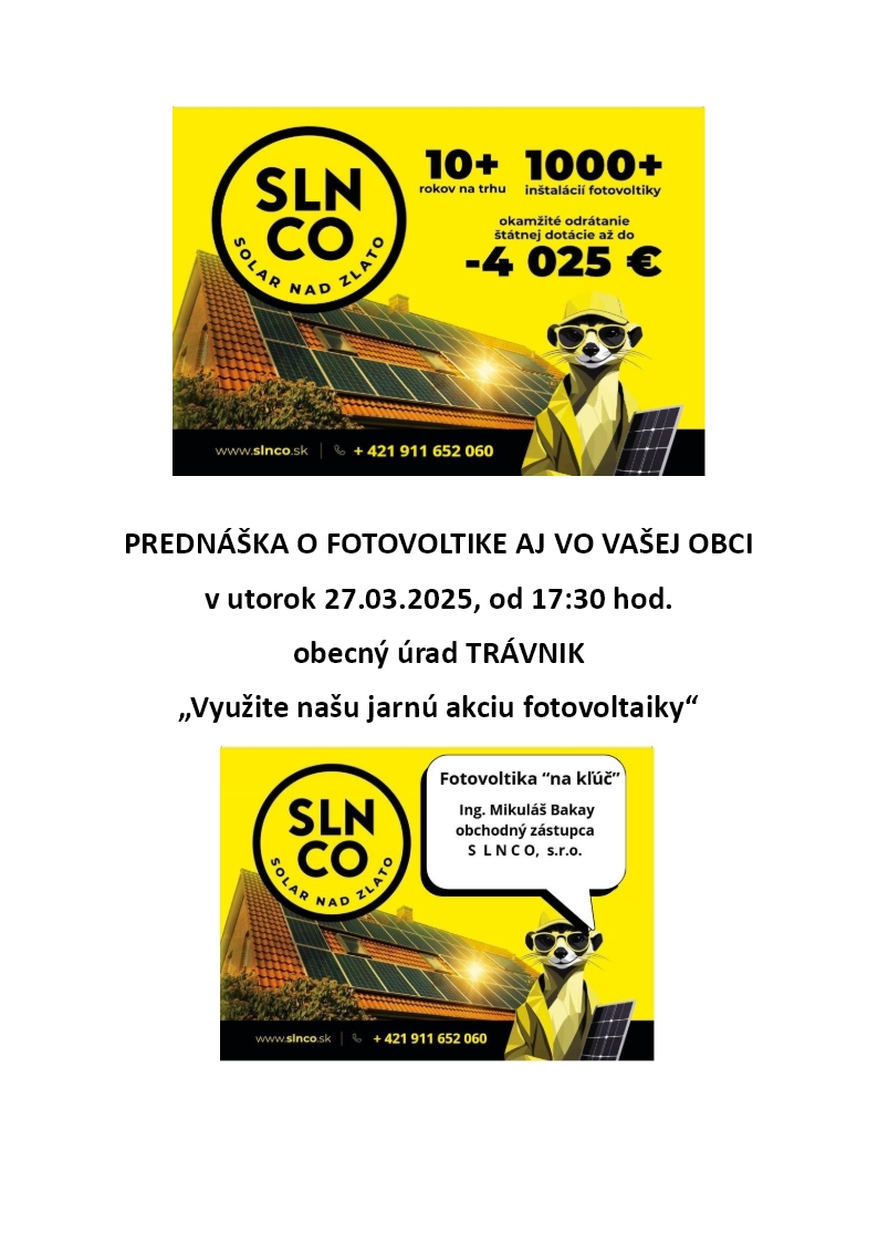 A S L N C O vállalat szeretettel meghívja Önöket előadására. A cég több mint 10 éve sikeresen realizálja a családi házak napelem rendszerét. Az előadáson teljeskörű információval szolgálnak az árakról, állami támogatásról és szívesen válaszolnak az Önök kérdéseire. Az előadás szlovák, valamint magyar nyelven fog megvalósulni , 2025. március 27-én, csütörtökön 17.30 órától a Községi hivatal nagytermében. Szeretettel várnak minden kedves érdeklődőt.