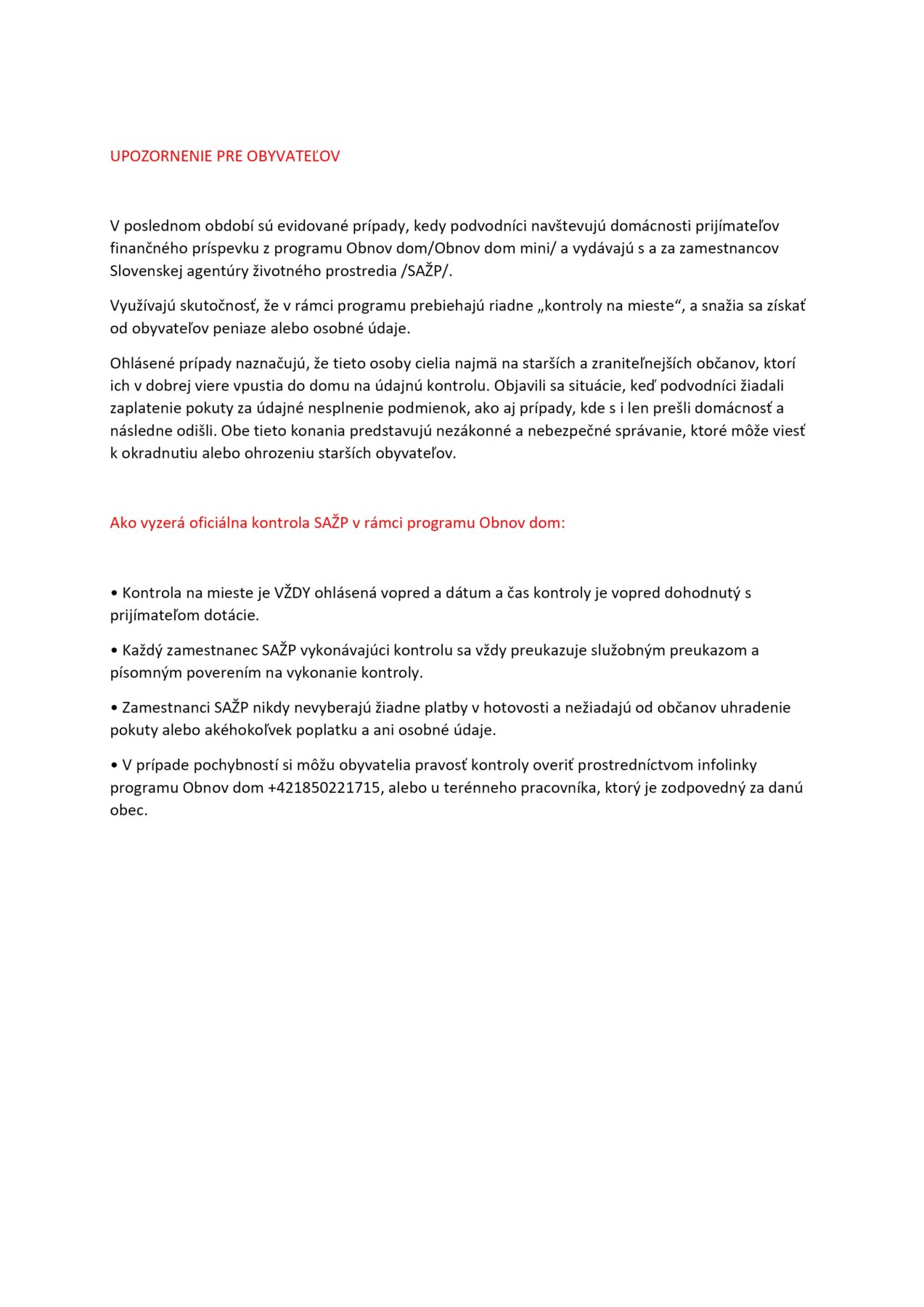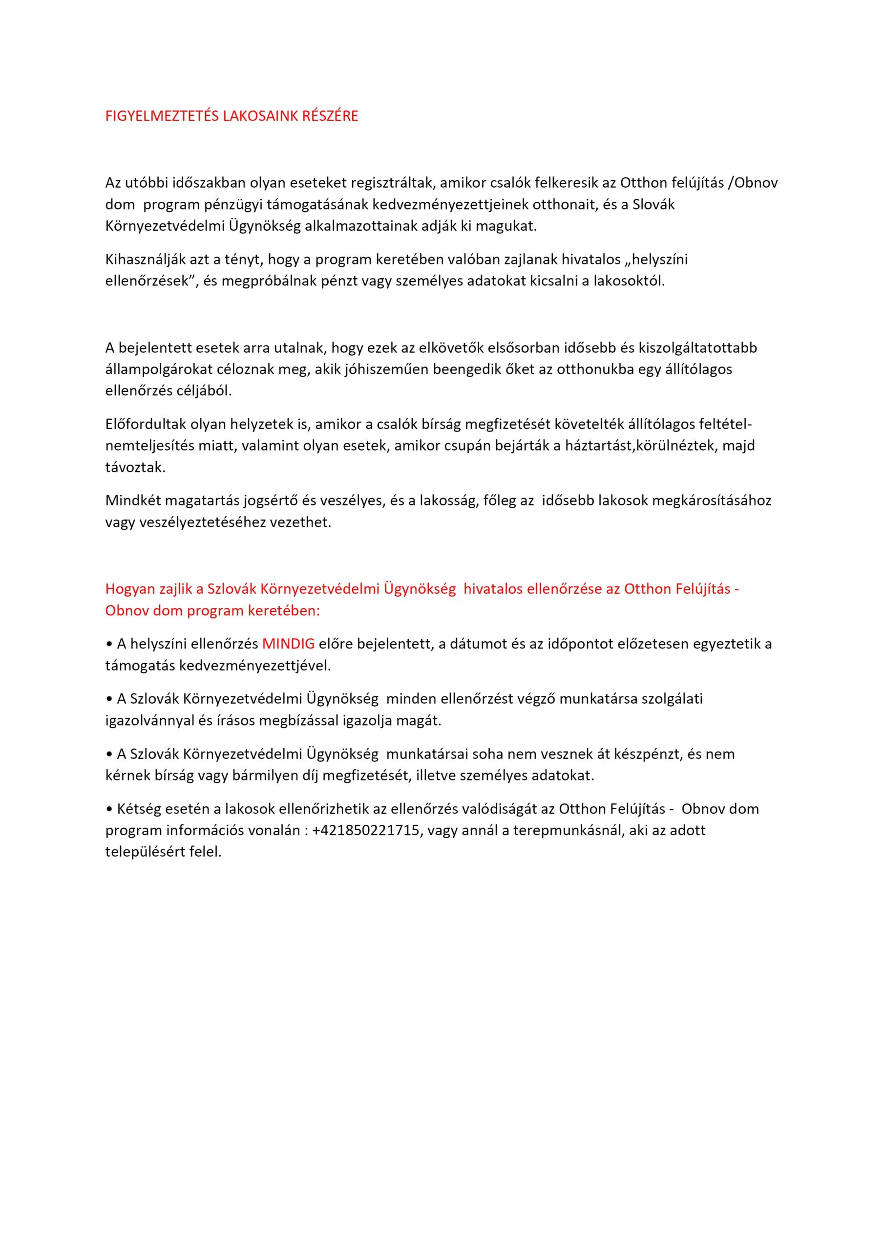 UPOZORNENIE PRE OBYVATEĽOV OBCE – FIGYELMEZTETÉS LAKOSAINK RÉSZÉRE